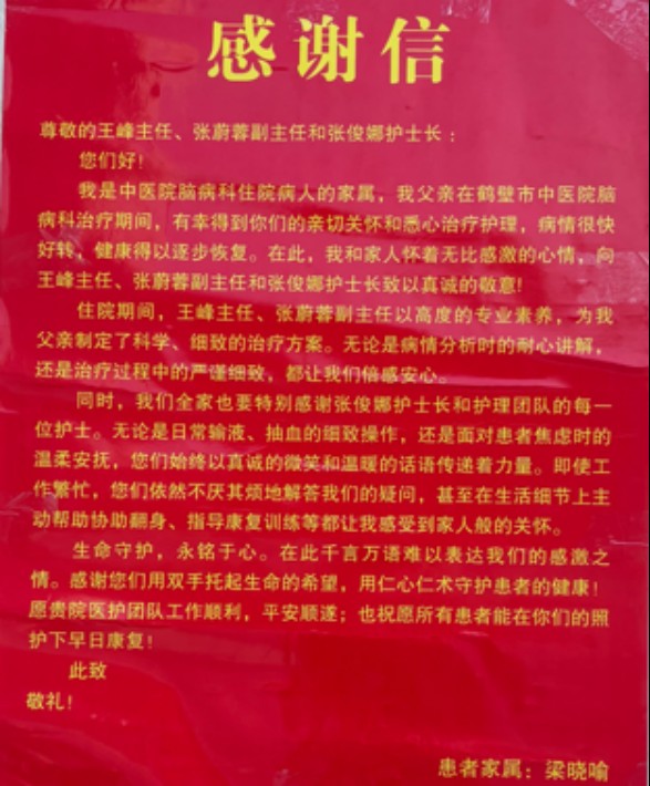 8月12日,鹤壁市中医院脑病科收到了一封情真意切的感谢信,信中家属用朴实的语言、真挚的情感,表达了对医护人员精湛医术和暖心服务的感激,字里行间流露出对医者仁心的敬意。