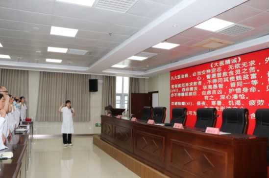 郑重的《大医精诚》宣誓环节将整场大会推向了高潮。在医务科主任王兴梅的带领下和逯志广的监督下,全体医师肃然起立,高举右手,齐声诵读这一被誉为医者行为准则的经典篇章。“凡大医治病,必当安神定志,无欲无求,先发大慈恻隐之心,誓愿普救含灵之苦……”洪亮而坚定的誓言在会场久久回响,这不仅是一次对初心的重温,更是一次对生命的郑重承诺,深深烙印在每一位医者的心中。