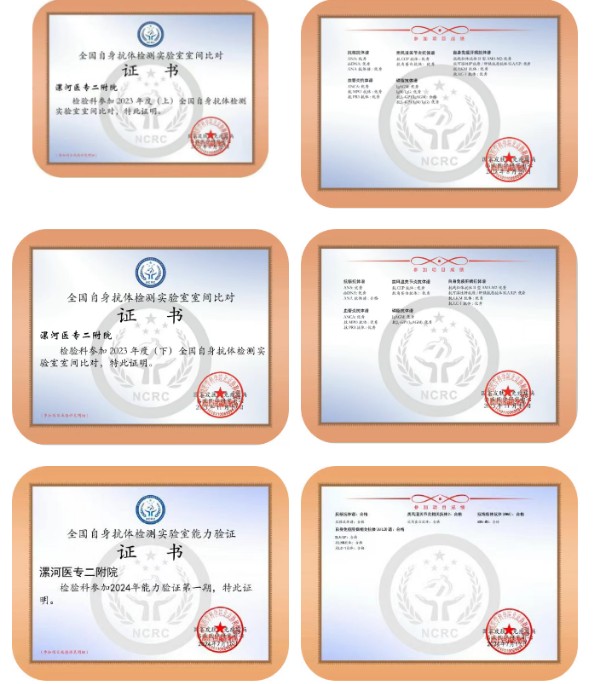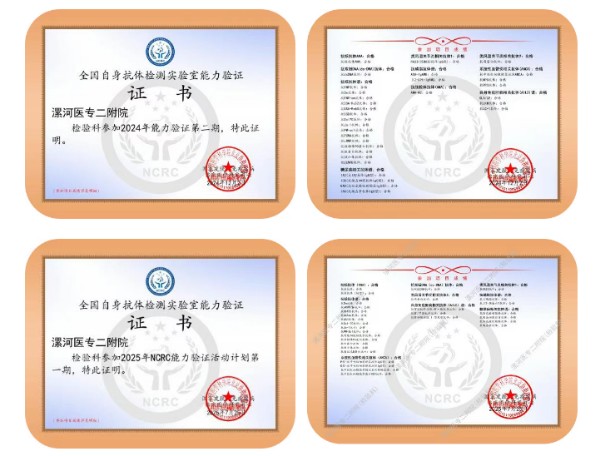 近日,漯河医专二附院(漯河市骨科医院、漯河市立医院)检验科自身免疫实验室在“国家皮肤与免疫疾病临床医学研究中心(NCRC)”组织、北京协和医院牵头的全国自身抗体检测实验室能力验证中,再次凭借卓越的检测能力和稳定的技术水平,斩获合格证书。这已经是自2023年以来,连续3年获此殊荣,充分说明了医院自身免疫实验室的检测结果与全国251家实验室数据高度一致,达到国家级标准化水平,为临床诊断提供了坚实可靠的依据。