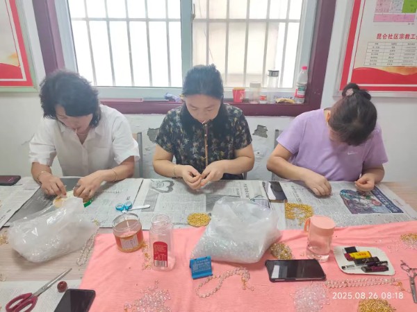 活动现场,“心灵手巧拈花指,七夕乞巧我和你” 穿针引线串手链活动成为焦点。居民们围坐在一起,穿针引线、精心编织,一双双巧手在丝线与珠子间灵活舞动。银针穿梭如蝶,彩线交织成趣,不一会儿,一条条精美别致的手链便在大家手中诞生。在这一过程中,欢声笑语此起彼伏,居民们相互交流技巧,分享着自己对七夕节的理解和感受。大家在飞针引线间感受着七夕乞巧习俗的韵味,在精美手链的熠熠光彩中,对七夕节的喜爱之情愈发浓烈,对传统文化的认同感也在不知不觉中增强。
