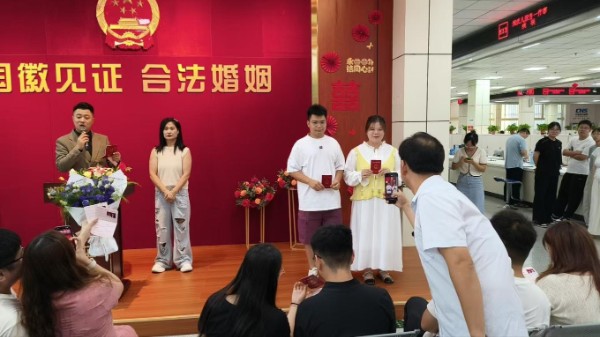 活动优化办证区域布置,窗口设“囍”字桌花,工作人员颁证时送定制祝福。核心环节集体宣誓中,新人在国徽下宣读誓词,专业摄影师拍摄“领证纪念照”。当日120对新人登记,新人代表张先生称:“集体宣誓让我体会到婚姻责任与神圣,终生难忘。”