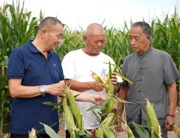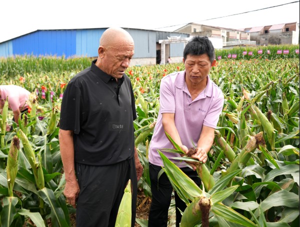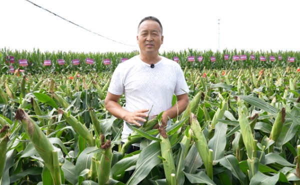 田间的另一边,零售商王海波正在为农户展示隆创310玉米棒,他剥开翠绿的玉米苞叶,只见密密麻麻的籽粒将玉米棒撑得满满当当,籽大粒深。他攥着手里的玉米讲道:“咱们现在看到的是夏播的隆创310,整体表现都非常好,穗位低,在85公分左右,抗青枯、无病害。”