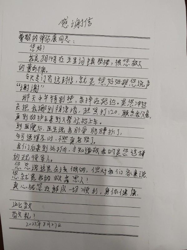 "尊敬的徐佑康同志:我是8月14日在五里河镇张楼被您救下的曹利楠。那天中午是您冲过来去把我挪到阴凉地,打120,联系我父亲,直到救护车来到又帮忙抬上车......医生说我肋骨、胳膊折了,多亏送医及时,不然真的危险了!"近日,开封市杞县现役军人徐佑康收到一封来自群众曹利楠的手写感谢信。信中,曹利楠详细回忆了事发当天的情景,多次提及"救命恩人",并祝愿徐佑康在部队一切顺利、身体健康。
