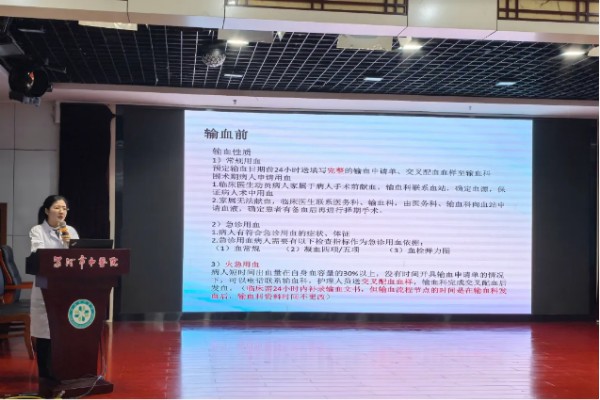 为进一步规范临床输血操作流程,强化医护人员输血安全意识,保障患者用血安全与医疗质量,9月12日至13日,漯河市中医院输血检验科在四楼会议室对全院医护人员分批开展临床输血专项培训。培训由输血检验科张丹丹讲解。
