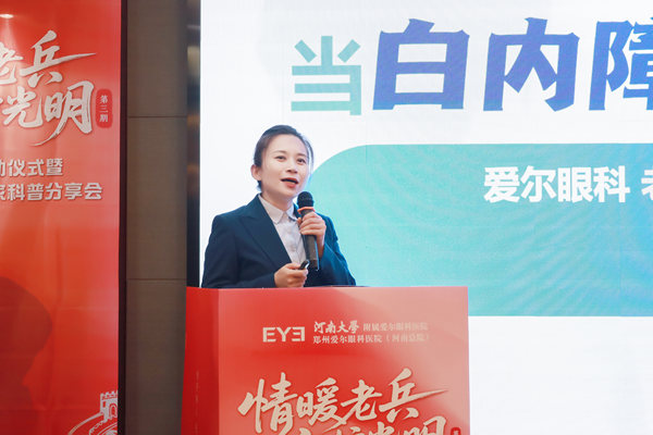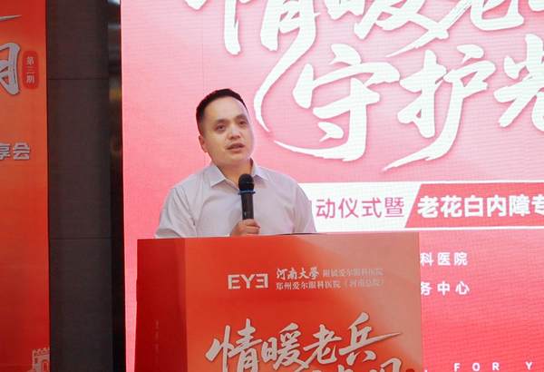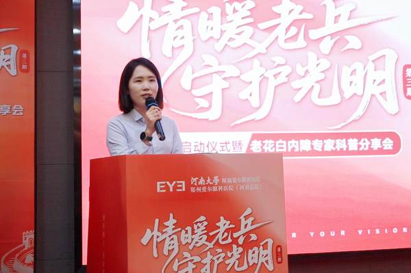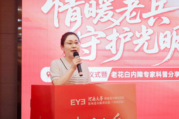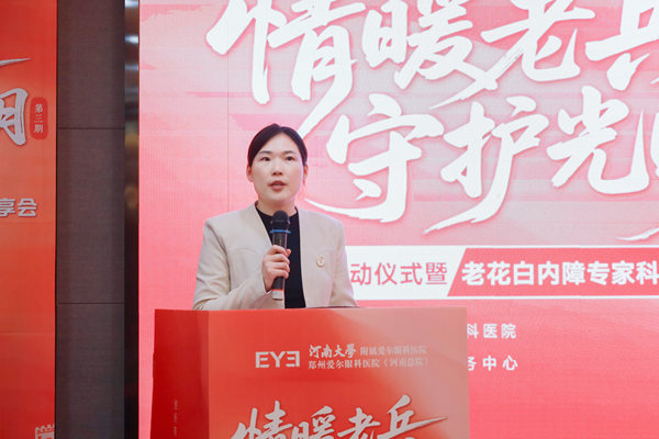 二七区退役军人服务中心主任刘海姣在致辞中表示:老兵是国家的脊梁,是时代的功臣,他们的健康幸福值得我们全心全意去守护。二七区有着光荣的双拥传统和浓厚的崇军氛围,服务保障好退役军人,既是职责所在,也是情感所系。对于“情暖老兵,守护光明”公益项目我们将全力配合项目开展,配合协同河南大学附属爱尔眼科医院将公益项目真正落实到实处,确保让更多有需要的退役军人及家属能够切实受益,真正把这项暖心工程办好办实。