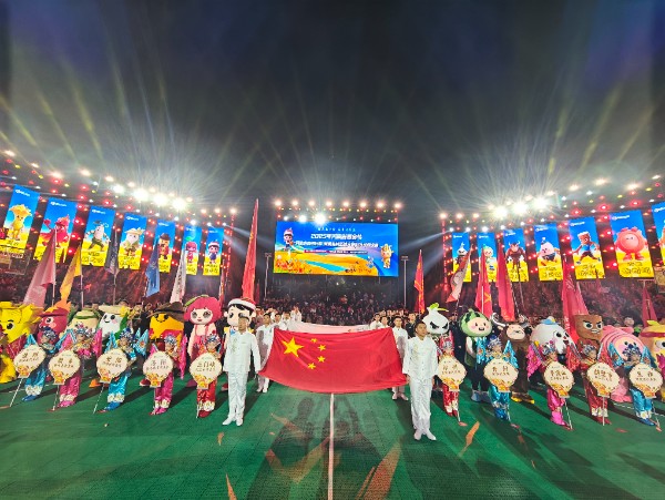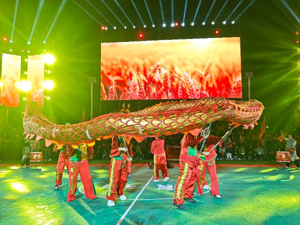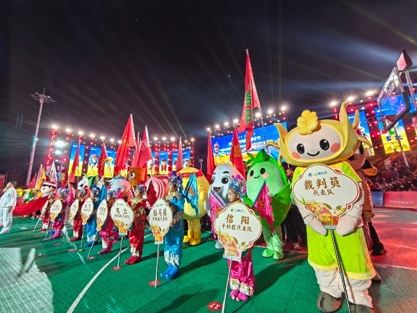 开幕式上,充满乡土气息的表演瞬间引爆全场。本次 “赛会节”两大吉祥物“豫小丰”与“灵小宝”首次同台亮相,与啦啦队联袂献艺:“豫小丰”以活泼麦穗男孩为形象,头部融入麦穗、玉米元素,麦芒化作翘发,脚边倚着篮球筐,传递河南农民乐观向上的精神,成为“体育+文化”助力乡村振兴的生动符号;“灵小宝”则以热情淳朴的乡村女孩为原型,头戴苹果帽,双马尾扎成麦穗样式,身穿运动装怀抱篮球,鲜活诠释“村 BA”的全民热情。篮球与丰收元素的碰撞,让赛场化作欢乐的海洋,村民欢呼声与篮球撞击地面的声响交织,尽显乡村体育的独特魅力。