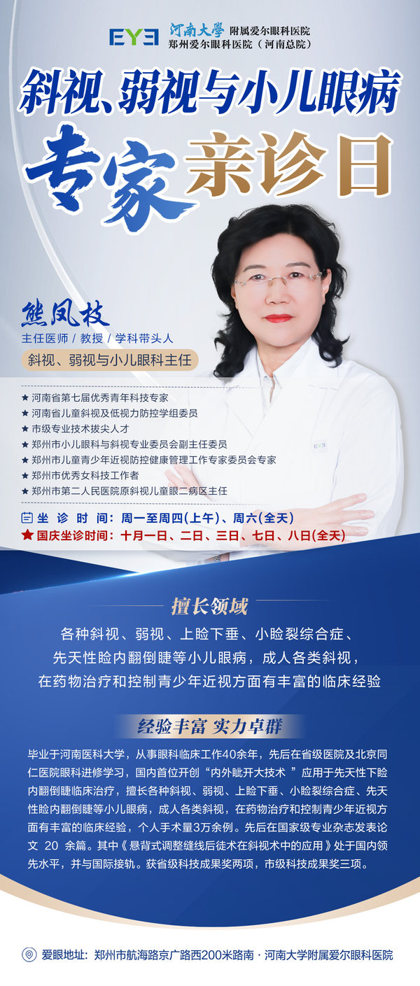河南小儿眼病专家,河南大学附属爱尔眼科医院斜视、弱视与小儿眼科主任熊凤枝教授:斜视是儿童眼病中比较常见的一种类型,很多家长其实对这个情况并不了解。有时候,自己在网上一查,发现这个问题可能要手术,急得跟没头苍蝇似的,但其实手术并不是斜视的“唯一解法”,有的孩子可能并不需要手术。