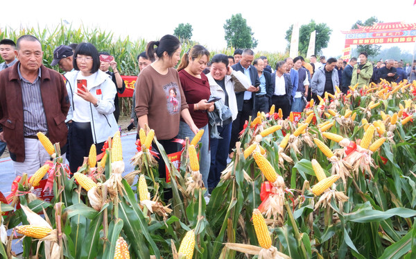 观摩现场,金色的玉米穗在秋风中轻轻摇曳,宛如一片金色的海洋。来自安徽、江苏等地的300余名经销商、零售商穿梭在田埂上,他们或俯身细察玉米长势,或掏出手机记录这丰收的景象。安徽省泗县经销商陈德元拨开一片玉米叶,指着饱满的玉米穗感慨道:“今年遭遇了54天极端高温天气,前期干旱后期多雨,但黄金棒696依然结实性好,抗锈病、抗穗腐表现突出,真是大灾之年见真章!”