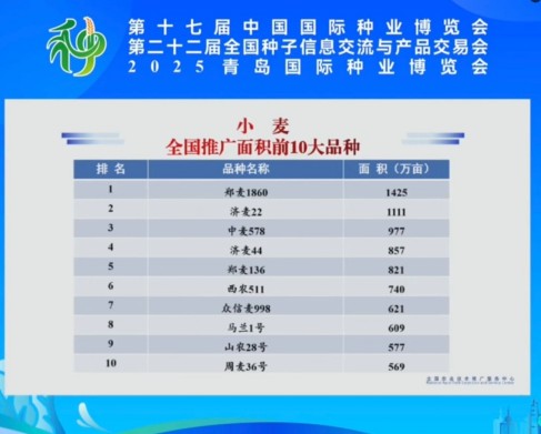 9月27日,第十七届中国国际种业博览会暨第二十二届全国种子信息交流与产品交易会在山东青岛举办。大会期间,全国农业技术推广服务中心发布了2024年度全国主要粮油和特色作物推广面积前十大品种发布,中国工程院院士、河南省农科院研究员许为钢团队选育的郑麦1860,以1425万亩的推广面积居小麦榜单第一名,成为全国种植面积最大的小麦品种。这是继许为钢团队选育的郑麦9023之后又一品种推广面积荣登全国第一。