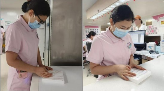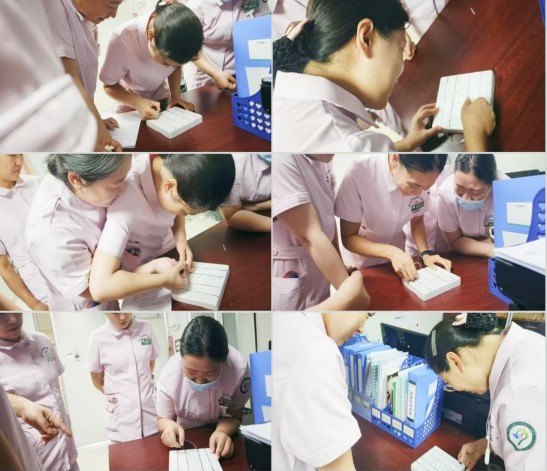 该院护理部下发《关于开展“针尖有爱 疼痛不再”无痛穿刺专项行动的通知》后,妇科病房积极响应,鼓励护士精进技术。陈丽燕是最先行动的人。她清楚静脉穿刺虽常见,但带来的紧张和疼痛会直接影响患者就医体验,这正是护理部 “将人文关怀融入每一次操作”的初衷。于是,她利用休息时间查文献,专攻 “无痛飞针”技术。没有模具,就用泡沫盒和勾线笔自制,反复练手法、力度、角度,技术越来越熟练。
