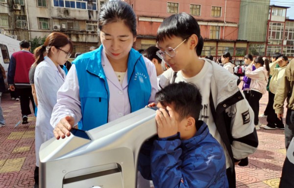 眼病筛查服务区内,平顶山市首席科普专家、舞钢锐视眼科副主任刘超英带领团队为学生开展视力检测,针对近视、远视、散光等问题排查视力隐患,通过眼部雾化缓解眼疲劳、干涩等不适。同时,专家还向学生普及护眼知识,指导养成正确读写姿势与用眼习惯,并提供眼镜清洗保养服务,发放爱眼宣传资料。
