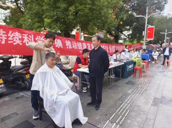 在中秋、国庆“双节”来临之际,为弘扬志愿服务精神,提升居民幸福感,9月30日上午,信阳市浉河区民权街道办事处礼节社区联合“支部联支部”共建单位信阳市疾控中心及乔美斯口腔、爱尔眼科、发流行美发等爱心企业,在胜利路步行街汇源小区共同开展“健康义诊、爱心理发”迎“双节”志愿服务活动。