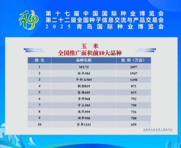 全国农业技术推广服务中心发布 全国玉米推广面积前十大品种联创种业独占三元 裕丰303、中科玉505、联创839分列第二、第三、第四位