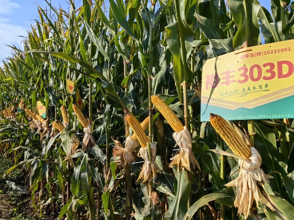 2024年推广面积达1947万亩的裕丰303具有广泛的适应性和稳定的丰产性。它对不同土壤类型和气候条件都有较好的耐受性,无论是在东北的黑土地,还是华北的黄土地,抑或是西北的干旱地区,都能展现出良好的生长态势。在丰产性方面,裕丰303的穗大粒多,籽粒饱满,千粒重高,经过多年的田间试验和大规模推广种植,平均亩产较对照品种有显著提高。同时,它还具备较强的抗倒伏能力,在生长后期即使遭遇大风等恶劣天气,也能保持较好的植株形态,减少产量损失。随着裕丰303D、裕丰303R、裕丰303H的快速推广,裕丰303的品种优势更加突出。2023年-2025年生物技术项目供种数量裕丰303均居首位,也从侧面印证了裕丰303巨大的优势,裕丰303D还被农业农村部列为2025年国家玉米主导品种。2023年10月7日,内蒙古自治区农牧厅组织的专家组在宁城测出玉米新品种裕丰303D比常规品种亩产量提高21.5%;2024年9月28日,内蒙古自治区生物育种测产小组在内蒙古自治区通辽市开鲁县开鲁镇对裕丰303D进行田间测产,比对照品种每亩高出247公斤,增产幅度33.4%,增产效果显著。