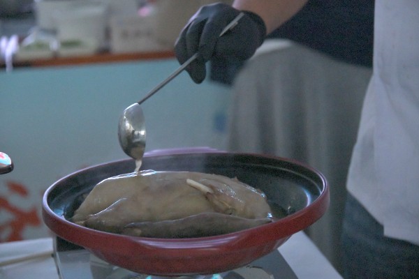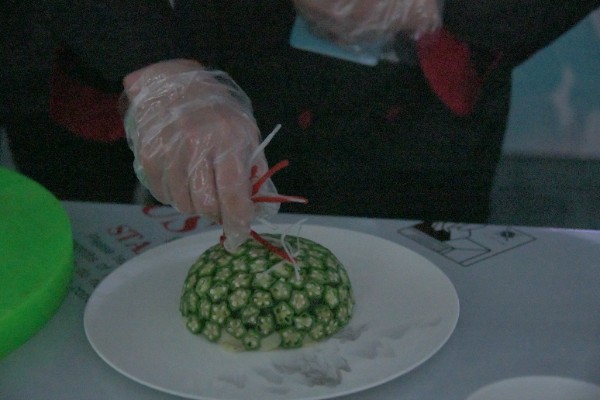 大赛现场,道地药材与烹饪技艺的碰撞精彩纷呈。选手们将传统技法与现代营养理念结合,打造出兼具色香味效的药膳作品。嵩县盛世白云大酒店的“黄精烧排骨”选用本地九蒸九晒的黄精与散养土猪,在保留食材本味的同时发挥黄精补气养阴功效;栾川县中医院及伊水湾大酒店选手焦星带来的“火晶柿子配葛粉马蹄糕”,则将药材融入现代茶点,展现药膳多元表达可能。