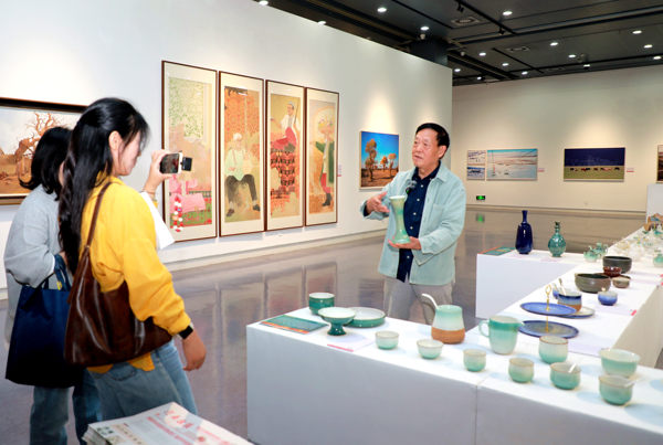 据悉,本次“山河相望 豫疆情深”主题展,由平顶山学院梅国建师生团队研发制作的“新疆新瓷”各类瓷种精品代表作参加展览,其中包含日用瓷、艺术瓷和建筑瓷三大类型中的精品作品,并且这些作品均在今年6月29日,在政府领导、高校学者、科研专家等多方力量的参与下,完成了研究成果鉴定。在河南省美术馆展览现场,梅国建详细介绍了“新疆新瓷”技术开发历程与陶瓷产品设计相关项目及研发成果。