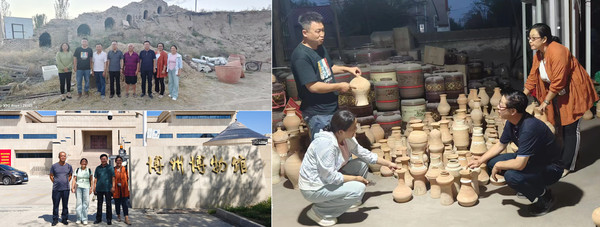 2024年5月,梅国建教授带领团队用初步烧制的4类新疆制瓷材料制成的瓷器,应邀参加巴里坤县举办的“新时代、新丝路、新瓷意-中原陶瓷重走新时代丝绸之路座谈会”,在会上他发表了对新疆矿物原料烧制瓷器的思路及其与中原文化的交融的研究报告,“新疆新瓷”开始逐步走入社会视野。座谈会后,梅国建教授带领团队成员先后四次赴哈密市巴里坤县周边进行原料采集调研,从吉朗德煤矿(夹层泥料)、三塘湖矿区、金矿尾料(发泡料)、罗布泊周边等处开展采集工作,此次共采集原料20余种,共10余吨,通过物流运输。经化验分析,原料多数为黏土类,以不同程度的含铁量分为红、黄、灰等颜色,可单独/搭配作为釉料使用,贫铁原料可作为胎料使用(对白度要求不高)。另有一类自发泡类原料,在1250℃煅烧后能够自行发泡,可用于制备保温材料、吸附材料及过滤材料。根据采集到的原料的性质,在丰富釉料类型的同时,对胎料开展加工,通过实验,选出3种适应性良好的胎料,分别呈黄色、灰白色、香灰色。