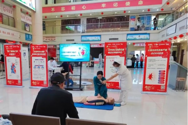 活动开始,该院心病科副主任陈云凭借其丰富的临床经验,通俗易懂地阐述了心血管疾病的流行现状、危险因素(如高血压、高血脂、高血糖、肥胖、吸烟、缺乏运动等)、早期症状识别及科学预防方法。随后,急诊科主治医师罗旋现场演示了心肺复苏术。通过细致地讲解与实际操作,罗旋医师精准展示了心肺复苏的具体步骤和关键要点。演示结束后,活动安排了互动模拟操作环节,现场观众积极投入,踊跃参与体验学习,现场气氛热烈。同时,活动现场布置了健康宣传海报,并向就诊患者及家属发放了心脏健康科普手册、宣传折页等资料。
