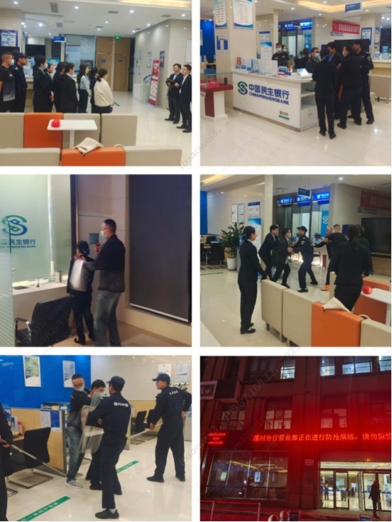 演练开始前,各网点分别利用晨夕会对演练预案进行学习和桌面推演,让一线员工熟悉各小组人员和分工。本次演练主要设置了持刀持枪抢劫客户、网点闹事等科目,演练开始后,各个岗位迅速进入角色,演练过程中,一线员工能够按照事前分工,沉着应对,报警组拨打报警电话、疏散组疏散客户撤离、有效拖延时间、警戒组做好警戒,保护好现场,等待公安机关来处置,每个环节有条不紊,临危不乱,演练达到既定效果。