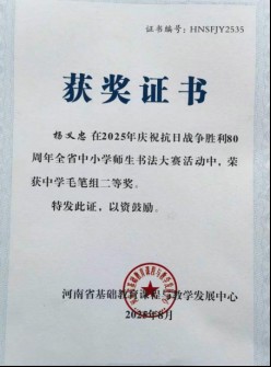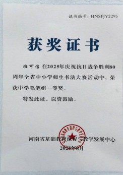 1、学生作业书写规范率从原来的65%提升至89%,卷面整洁度显著提高。多名学生在市、县级书法比赛中获奖。2024年,上蔡县首届“李斯书法奖”青少年书法大赛,明帅臻同学获得毛笔少年组一等奖,臧尾科、班可洁、周怡璇、杨义忠等同学获优秀奖。郝洪博、赵炫诚同学获硬笔少年组二等奖,李梓瑶 、田家宇、张家齐、苏泽众等同学获优秀奖。2024年,全县中小学现场书画大赛,周怡彤同学获二等奖。在纪念中国人民抗日战争暨世界反法西斯战争胜利80周年全省中小学师生书法大赛活动中,班可洁、杨忠义两位同学分别荣获中学毛笔组一、二等奖。