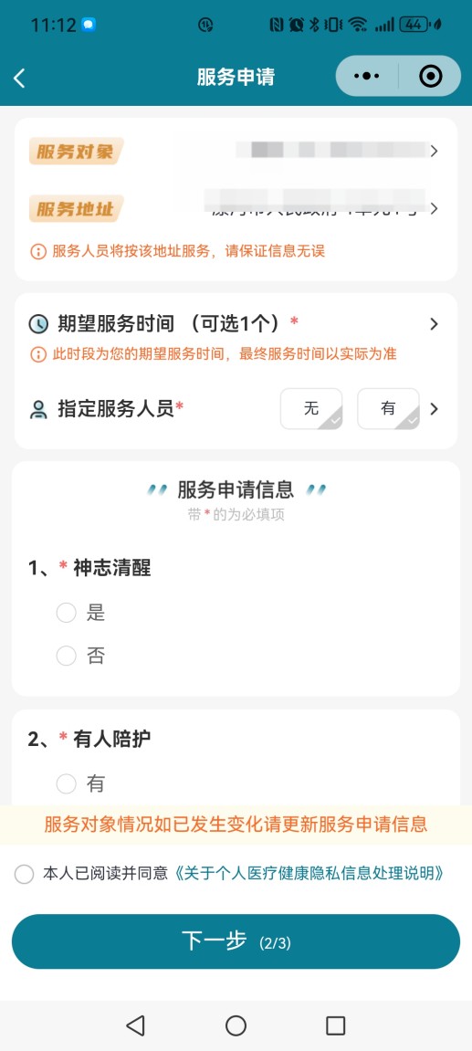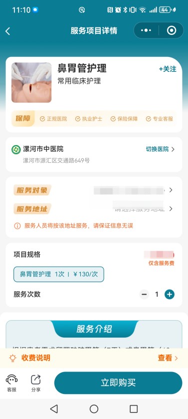 选择项目规格,填写“服务对象”信息与“服务地址”(首次使用需实名认证)