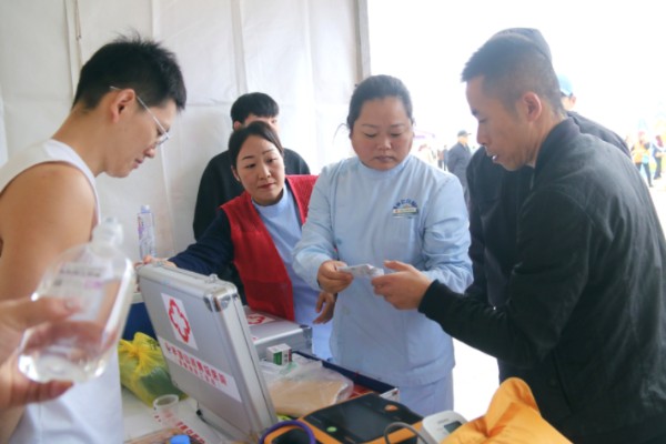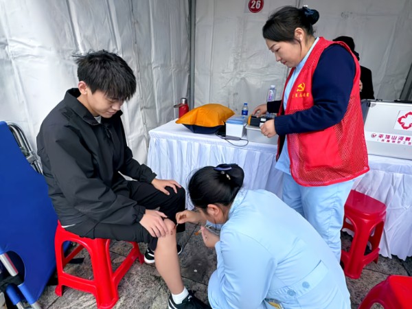 医疗保障团队既守护参赛健儿,也贴心服务观赛群众。在医疗应急补给区及相关服务点位,应急保障医务人员为观赛群众提供免费血压监测、心肺听诊等基础健康服务,耐心解答用药咨询。同时紧盯赛场动态,对因比赛不慎擦伤的运动员,第一时间开展伤口清洁、消毒、包扎等应急处理。
