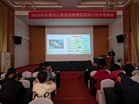 杜西河博士则通过通俗易懂的方式,向种植户详细介绍了小麦抗湿晚播的栽培技术。他指出,“晚播不等于不高产”,充足的底墒反而为来年小麦高产提供了有利条件。针对晚播小麦,他提出了“四补一促”的关键技术措施:一是选用半冬性或偏春性品种;二是合理密植,根据晚播天数适当增加播量;三是注意播种深度,控制在2-4公分,避免过深导致出苗缓慢;四是增施底肥,确保养分充足;五是全程强化管理,以促为主,确保弱苗转壮。