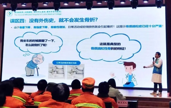 活动中,该院骨科专家王松茂聚焦10月20日“世界骨质疏松日”主题,针对基层群众尤其是环卫工人的工作特点,开展骨质疏松专题健康科普讲座。讲座内容贴合群众需求,从骨质疏松的成因、早期症状、预防方法到日常养护要点,进行了通俗细致的讲解,帮助群众建立科学的骨骼健康认知,为预防骨质疏松奠定基础。