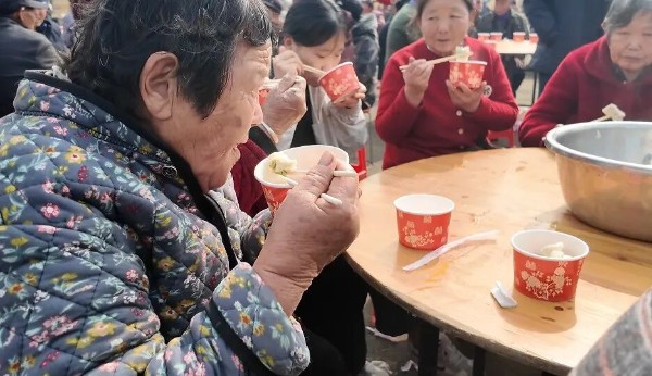 村活动中心另一角,志愿者们正热火朝天地筹备“孝心饺子宴”:和面、擀皮、调馅分工明确,很快一排排饱满的饺子就摆满案板。第一锅饺子出锅后,志愿者和村里孩子一起,小心翼翼送到每位老人面前。老人们吃着饺子唠家常,孩子们在旁玩耍,活动中心满是欢声笑语,秋日里的温馨氛围格外动人。