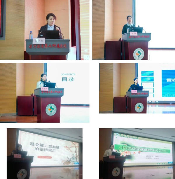 授课环节,漯河医专二附院康复科主任张静,漯河市中医院妇产科主治中医师位路其,高级讲师李少莹,漯河医专二附院妇产科助产士王梦丽、妇产科副主任中医师王伟伟,分别就《产后病的中医治疗》《中药外治法在产后腹痛中的临床应用》《雷达技术在盆底诊疗中的应用》《温灸罐与燃脂罐临床应用》《中医外治在产后康复中的临床应用》等内容进行分享。