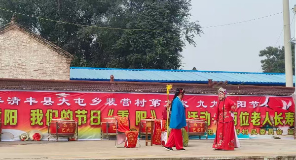 10月24日,一个连绵不断秋雨后的深秋上午, 在清丰县大屯乡裴营村东头文化广场上,锣鼓喧天,人头攒动。印着“孝满金秋 情暖重阳——我们的节日《重阳》主题活动——百位老人长寿宴”鎏金大字的巨大横幅格外夺目,成为一道亮丽风景。热闹非凡的现场既不是过节,也不是来赶集,而是在为本村的老人举办百位老人长寿宴,为老人们过重阳节。