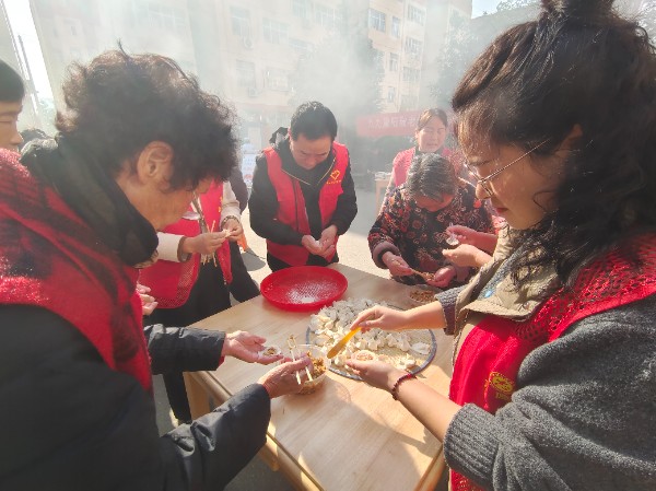 除了各项便民服务外,“暖心包饺子”活动更是将现场氛围推向了高潮。党员志愿者与小区老年业主围坐在一起,分工明确、协作默契,揉面、擀皮、包饺子的动作行云流水,大家忙得不亦乐乎。不一会儿,一锅锅热腾腾的饺子陆续出锅,香气四溢。志愿者们将煮好的饺子小心翼翼地端到每位老年业主手中,老人们一边品尝着香喷喷的饺子,一边拉着家常,脸上洋溢着幸福的笑容,现场充满了欢声笑语,浓浓的邻里情和节日的温馨在空气中悄然弥漫。