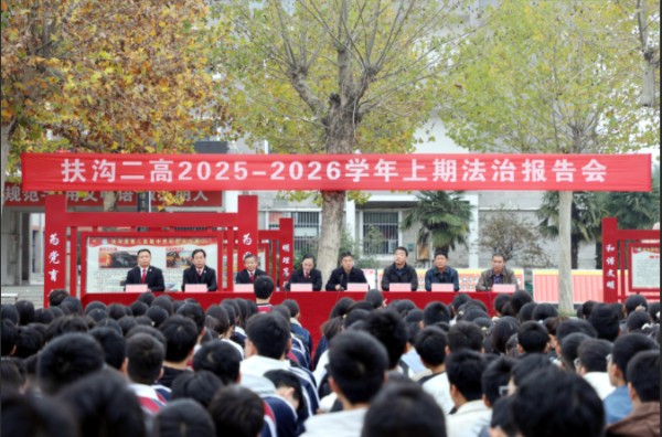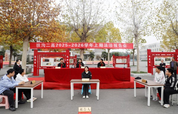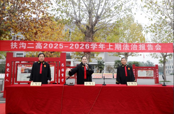 为进一步加强青少年法治教育,提升师生法治意识,10月29日下午,扶沟县人民法院家事庭庭长范娜娜、少年刑事审判庭庭长顾孝勇、副庭长李国会等一行走进扶沟县第二高级中学,为一、二年级全体师生带来了一场内容丰富、形式生动的法治报告会。此次活动以“法律,我们青春路上的‘灯塔’与‘铠甲’”为主题,通过庄严仪式、专题报告、模拟法庭及读本发放等多种形式,在校园内营造了尊法、学法、守法、用法的浓厚氛围。
