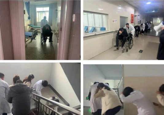 演练正式开始前,该院安全生产工作负责人结合医疗场所人员密集、环境特殊的特点,进行了专项培训。培训中,详细讲解了火灾初期的逃生自救技巧、灭火器及消防栓等器材的规范操作步骤,同时针对地震灾害特性,系统阐述了“先避险、后疏散”的原则,明确了室内紧急蹲躲位置、疏散路线规划及现场人员引导要点,确保全体参训人员熟练掌握应急处置核心知识。随着演练信号发出,各环节紧张有序推进:地震演练中,职工迅速抱头蹲躲于安全位置;消防安全疏散环节,大家用湿毛巾捂住口鼻,保持弯腰低姿前行。针对行动不便的患者,工作人员提前预判、分工协作,采取搀扶、轮椅推送、担架转运等针对性方式全程协助,沿预设安全路线有序撤离,最终全员安全抵达室外指定集结区域。