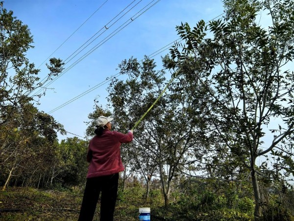 “碧根果树从小苗栽植到实现丰产通常需要8—10年,这期间是树体培育的关键期,如果移植补种、整形修剪、施肥除虫等林间作业不够细致,就会影响将来的产量。”徐堂村村民苏永雨曾在广东种过荔枝、龙眼,对特色经济作物种植很有心得,4年前来到果园当上了一名管理者,在他的悉心管护下,果园的一切变得井井有条。