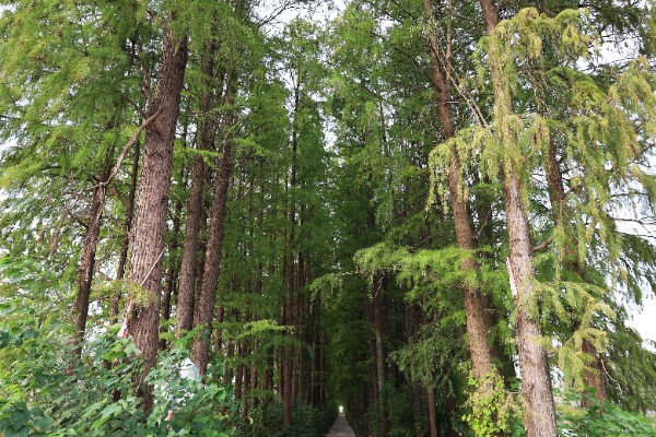 成片的落羽杉如绿色的织锦,在秋日晕染出红绿相间的斑斓;湖畔的杉树临水而立,枝叶婆娑,将水面晕染成一幅灵动的生态画卷;林间小道旁,高大的落羽杉笔直挺拔,诉说着数十年的培育历程。