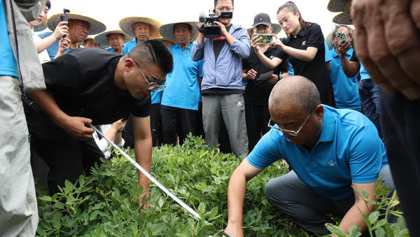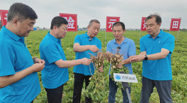 值得一提的是,现场测产点燃了大家的热情。几位农技人员拿出尺子测量地块面积,现场拔出花生、采摘、称重,围观的经销商和种植户充满期待。“这块花生田,亩产达到694.68公斤!”当测产结果公布时,现场顿时响起热烈的掌声。