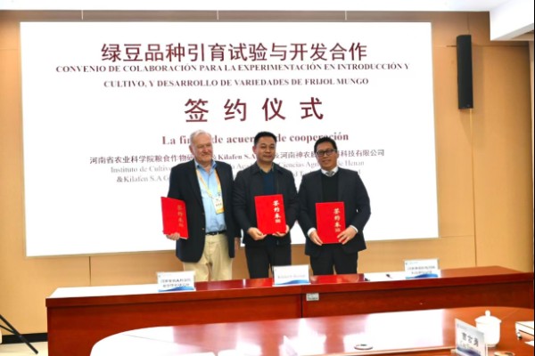 河南省农业科学院粮食作物研究所所长程泽强、乌拉圭吉拉芬公司董事长戈登·斯托里、河南神农膨化饲料科技有限公司董事长董鹰隼共同上台签署合作协议,标志着豫乌绿豆品种引育试验与开发合作工作正式启动。根据合作协议,河南省合作单位与乌拉圭佛罗里达省合作企业将整合双方优势,共同培育适应性更广、产量更高的绿豆新品种,扩大种植面积与种植效益,同时推动国际绿豆品质标准的统一和提升,为全球杂粮产业发展贡献力量。此外,应对全球气候变化,合作方还将打通“实验室-农田-餐桌”的全产业链条,加速科技成果转化,培养国际化农业科技人才。