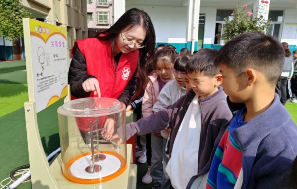 活动现场,设有6大特色展示体验区,每个区域都吸引众多学生和家长驻足参与和观摩。科普大篷车带来的科技展品让孩子们直呼“过瘾”。磁力传动摆、声悬浮球、静电发生器、旋转的银蛋等展品整齐摆放,同学们争先恐后地动手操作。“哇,我的头发竖起来了!”在静电发生器展品前,一名女生兴奋地喊道,引来阵阵欢笑。科普志愿者程丽芳、王昱涵向同学们讲解了科技产品的构造、科学原理、操作步骤。冯杨晨可和其他同学一起亲手做着实验,喜悦地说:“这些展品太神奇了,让我大开眼界……”大家在亲手操作中,直观感受着物理、化学等“流动科技馆”的无穷科学魅力,让原本抽象的科学原理变得生动易懂。