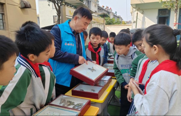 昆虫标本展示区成为青少年探索大自然奥秘的微观生命观察窗口。河南省首席科普专家、高级工程师万少侠向学生详细讲解不同昆虫的生活习性、发生规律、危害与防治、标本制作,同学们一边聆听专家的讲解,一边参观蝴蝶、双叉犀金龟、金龟子等各类昆虫标本,每一件都制作精美,附带的标签详细标注了物种名称、生活习性和分布区域。“原来这就是竹节虫,居然和树枝长得这么像!”几名小学生围在展柜前,一边观察一边小声讨论。万少侠耐心解答师生提出的疑问:“昆虫是自然界的重要组成部分,通过观察标本,我们能更好地了解昆虫的生存智慧,从而学会保护生物的多样性。”同时,舞钢市白蚁研究所科技人员向广大师生详细讲解了白蚁生态特征、分布范围、危害与防治方法,并展示了白蚁不同种类和类型的标本,以及危害水库堤垻、房屋建筑等多种实物样品和图片。不少孩子拿出笔记本,认真记录下感兴趣的知识点,在心中种下了探索大自然的种子。