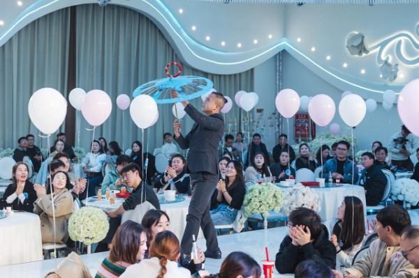 开场舞蹈《爱你》以活泼热情的表演迅速点燃现场氛围,为联谊会拉开序幕。随后的破冰互动环节设置了“击鼓传花”游戏,被选中的嘉宾依次上台进行自我介绍,并获赠玫瑰花作为参与纪念。活动中穿插的杂技表演进一步烘托了现场热烈气氛,有效缓解了青年初次见面的拘谨感。