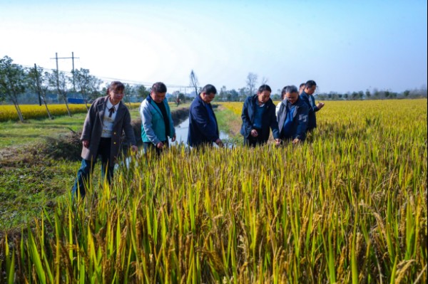11月5日-6日,河南省水稻产业科技特派员服务团团长、河南农业大学李俊周教授,联合信阳市农科院扶定研究员和罗山县农科所专家,赴信阳市罗山县周党镇稻渔综合种养示范基地,开展品种和技术应用的评价与测产。经现场观测,示范品种“珠两优5298”群体足、结实率高、抗病性好、抗倒性强,示范方亩产达650公斤以上,较当地其他田块亩产提升近50斤,“三增三减”丰产高效技术实施效果明显。