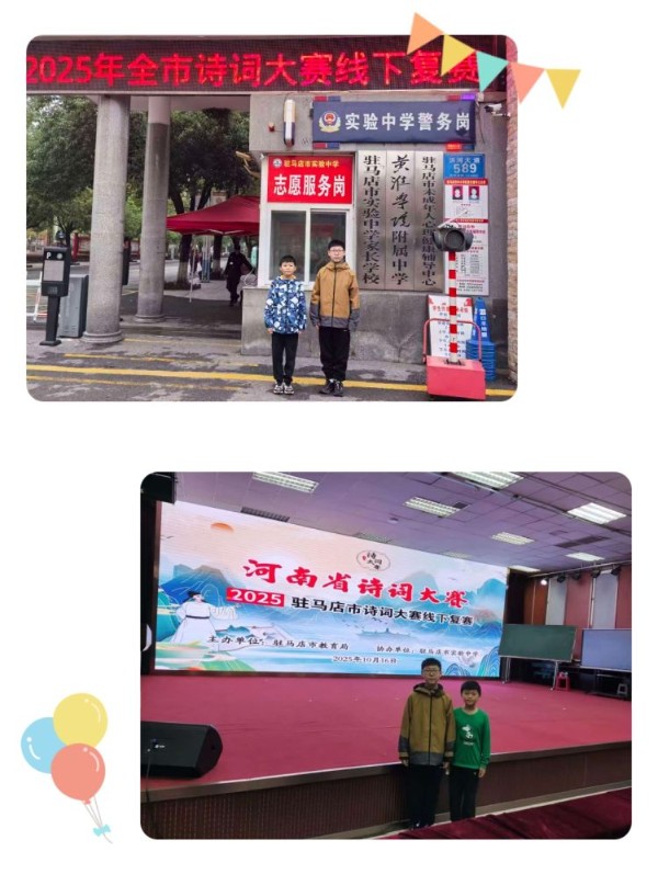 2025年10月19日,驻马店市实验中学迎来了全市诗词高手云集的线下复赛。面对激烈的竞争,王韵喆、潘俊宇两位同学沉着应对,以深厚的诗词底蕴分别获得晋级省赛的资格。