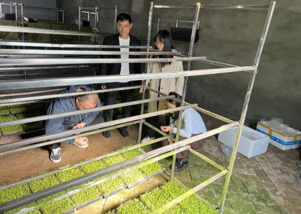 在文博五谷芽苗菜种植农民专业合作社智能化生产基地,专家团队系统观摩了花生芽菜从选种、浸种、人工播种到催芽管理的全流程标准化生产体系。针对人工播种环节存在的效率低、劳动强度大等瓶颈问题,孙晓静结合前期研究成果,提出两项创新改进方案:一是设计轻量化播种器具,通过优化种子分布结构减少重复操作;二是制定“三步定位播种法”,将单盘播种时间缩短40%的同时提升芽苗整齐度。合作社负责人现场试用改良工具后表示:“新方案既保留了手工播种的精准性,又大幅降低了人力成本,对规模化生产具有直接指导价值。”