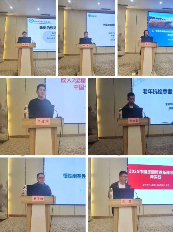 会议邀请河南省医学会老年医学分会主任委员、郑州大学第一附属医院老年内分泌科主任杨再刚,漯河市中心医院西城分院副院长刘军、漯河医专二附院内一科主任徐文俭,漯河市第二人民医院老年医学科卫青园,漯河市中心医院消化内科郭熔哲,漯河市中医院呼吸内科韩飞翔,漯河市中心医院老年医学科晁召进行学术授课,七位教授围绕老年医学的热点、难点问题,带来了精彩纷呈的专题报告,依照最新指南探讨了跌倒的预防与管理、老年睡眠障碍的治疗、老年糖尿病最新指南解读、成人2型糖尿病的高血压管理中国专家共识、老年抗栓患者的胃肠道保护策略、慢性阻塞性肺疾病指南解读以及2025年房颤指南解读等。