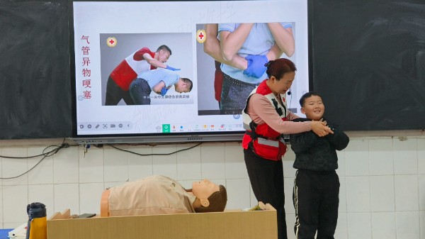 在应急知识科普环节,针对气道异物梗阻、心肺复苏、海姆立克急救、AED使用等关键技能,驻马店市红十字会讲师吴春华没有局限于枯燥的理论讲解,而是将真实案例与实操教学紧密结合。“有个和你们差不多大的孩子,边跑边吃果冻时突然呛咳倒地,双手紧紧抓着喉咙,这时候拍背喂水都是错误做法。”她结合少年儿童常见的意外场景,细致拆解海姆立克急救法的操作要领,针对儿童自救、同伴互救两种场景分别演示,让原本严肃的急救知识变得生动易记,也让学生们真切感受到“掌握技能就能守护生命”的力量。