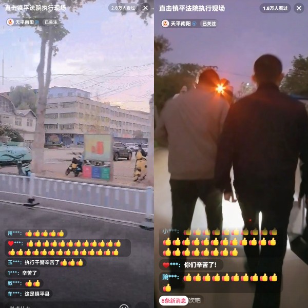 11月13日清晨6点,镇平县人民法院开展集中执行行动,此次行动在南阳市中级人民法院政务抖音号“天平南阳”、河南广播电视台“执行局来了”抖音号及各媒体平台全程直播,并特邀人大代表、政协委员全程见证执行,执行干警们一边查找失信被执行人,一边在线普法,吸引数十万网友在线围观。