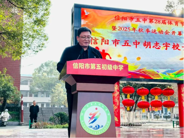 信阳市五中校长胡志宇发表致辞,他说:“强健的体魄、坚韧的心志、协作的意识,是新时代少年驰骋未来的通行证。同学们,当你们踏上跑道,那是毅力与耐力的较量;当你们腾跃横杆,那是勇气与胆识的迸发;当你们传递接力棒,那是信任与协作的凝聚。请牢记:真正的胜利并非仅属于榜首,更属于每一个超越自我的身影。请以“赛出风格”为信念,尊重规则、服从裁判;请以“赛出水平”为目标,全力以赴、挑战极限;请以“安全第一”为准则,科学防护、文明参赛。让我们共同见证:体育精神如何在一项项赛事中升华为五中校园文化,如何在一张张青春笑靥里镌刻永恒记忆!”
