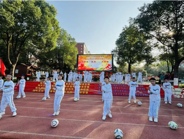 七年级一级部的足球操表演,同学们随着欢快的音乐节奏,灵活地操控着足球。他们的身影跃动,仿佛是一群灵动的小精灵,踢出了青春的节奏与活力,让我们感受到了足球的魅力与运动的快乐。