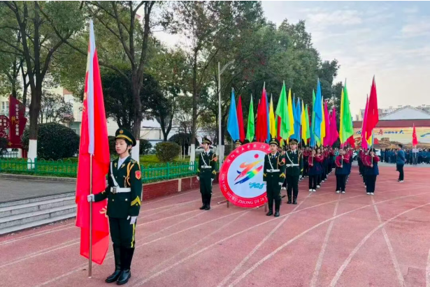 信阳市五中党委书记张磊铿锵有力地宣布:“信阳市第五初级中学第28届体育节暨2025年秋季运动会正式开幕!”